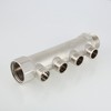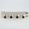 Латунный никелированный коллектор на 2, 3 или 4 выхода диаметром 1/2" с наружной резьбой. Диаметр коллектора – 3/4 или 1", резьба – внутренняя/наружная. Рабочая температура теплоносителя – до 130 °С, давление – до 16 бар. Применяется для распределения потоков жидкостей в контурах теплого пола, радиаторного отопления, холодного и горячего водоснабжения.