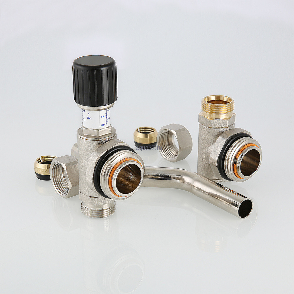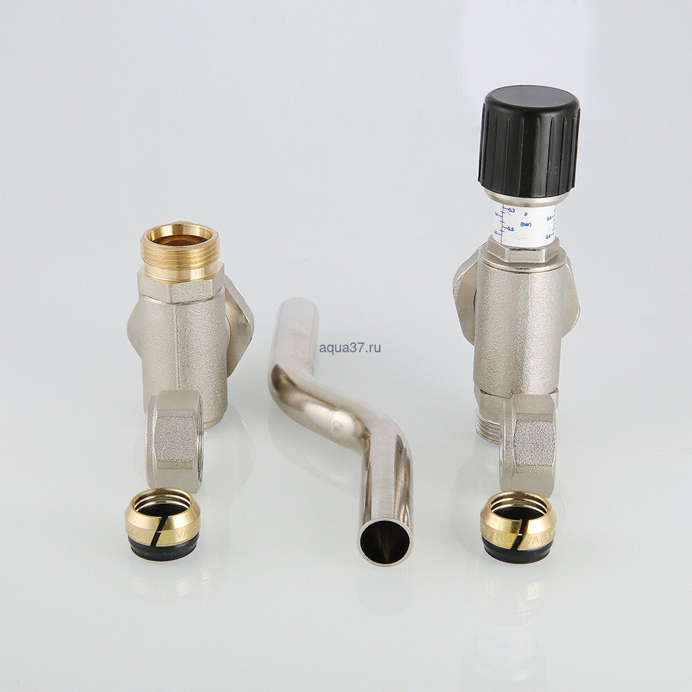 Место установки тупикового байпаса – противоположная относительно точек подключения сторона коллекторного узла. Материал корпуса – латунь марки CW617N, перепускной трубки – медь, уплотнений – EPDM. Гальванопокрытие – никелирование. Изделие применимо при температуре не выше 120 °C, давлении до 10 бар. Диапазон настройки перепада давлений – 20–60 кПа, пропускная способность Kvs – 4,33 м3/ч.