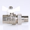 Прямой полнопроходной ремонтопригодный шаровой кран с увеличенным ресурсом. Соединен накидной гайкой с резьбовым полусгоном. Корпуса деталей – латунные, никелированные. Кран оснащен ручкой типа «бабочка» с утолщенной стенкой из алюминиевого сплава и эпоксидной покраской белого цвета. Резьба присоединений – внутренняя/наружная.