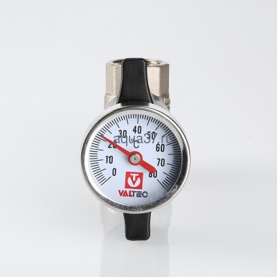 Термометр, встроенный в рукоятку управления шарового крана VALTEC BASE VT.808, обеспечивает визуальный контроль температуры рабочей среды в тепловых пунктах, узлах ввода горячей воды, трубопроводах обвязки бойлера и других точках инженерных систем. Термометр соединен с шаровым затвором гильзой из медного сплава, что позволяет измерять температуру с минимальной погрешностью. При необходимости прибор легко извлекается из рукоятки, а его гнездо закрывается заглушкой из ABS-пластика. Из этого же материала выполнена и сама рукоятка крана. Диаметр шкалы термометра – 42 мм, диапазон измерений – 0–120 °С. Резьба присоединения шарового крана с термометром VT.808 – внутренняя.