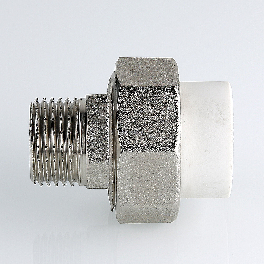 Полипропиленовый фитинг для создания разъемного, с использованием накидной гайки, соединения полипропиленового трубопровода с трубопроводом или арматурой из других материалов. Уплотнительное кольцо выполнено из синтетического каучука EPDM. Резьба фитинга – наружная трубная по ГОСТу 6357.