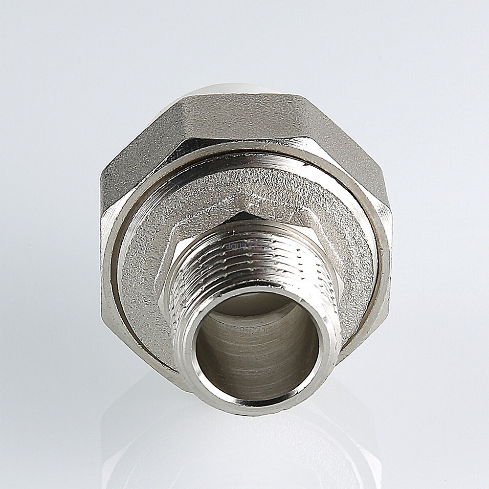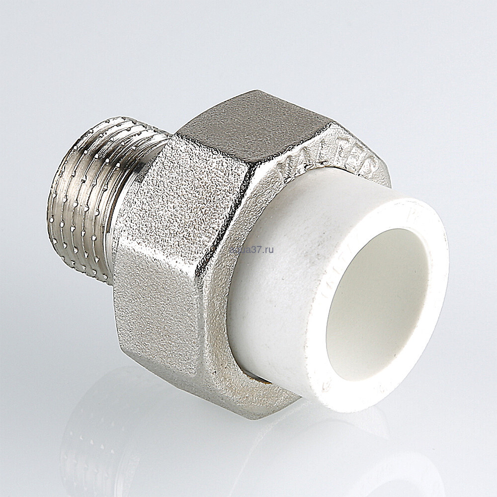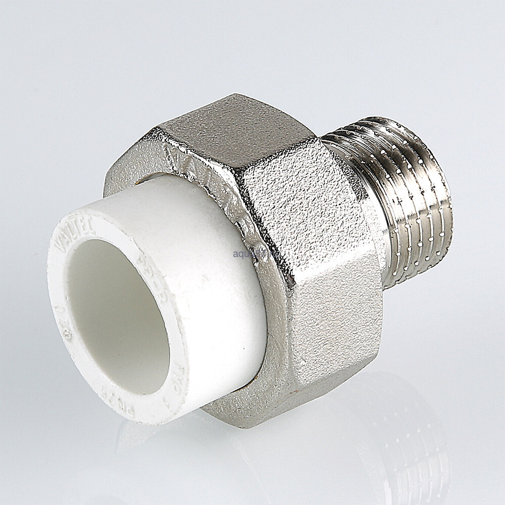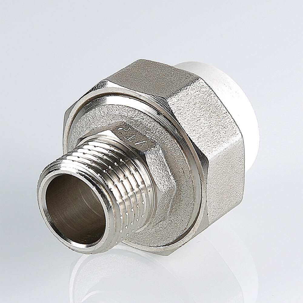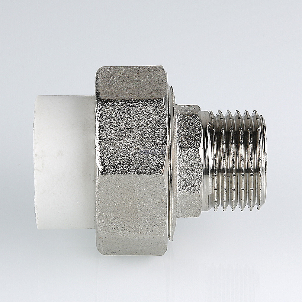 Полипропиленовый фитинг для создания разъемного, с использованием накидной гайки, соединения полипропиленового трубопровода с трубопроводом или арматурой из других материалов. Уплотнительное кольцо выполнено из синтетического каучука EPDM. Резьба фитинга – наружная трубная по ГОСТу 6357.