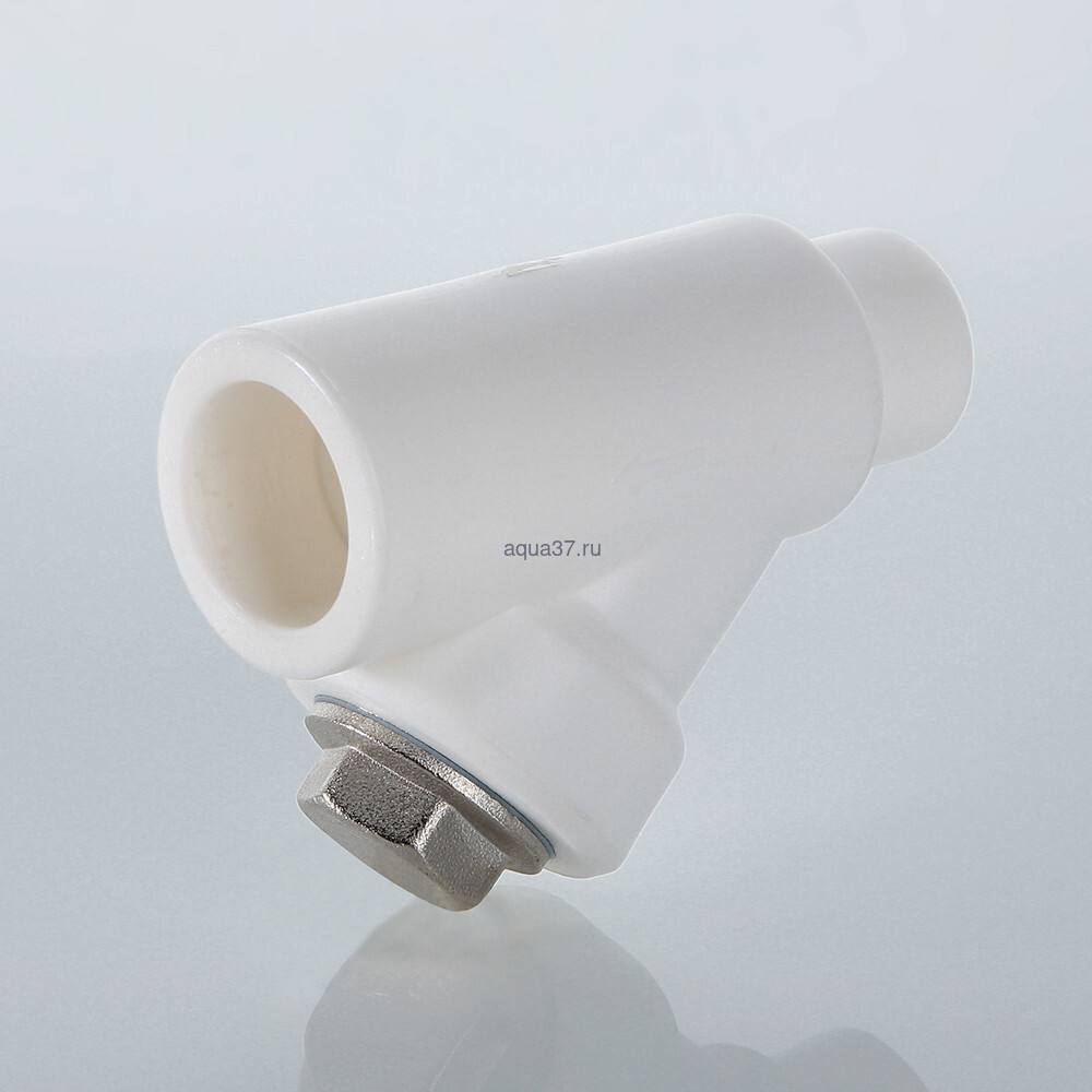 Фильтр с корпусом из полипропилена и сетчатым элементом из нержавеющей стали марки AISI 304, предназначенный для очистки транспортируемой жидкости от нерастворимых примесей размером от 300 мкм. Используется в составе систем из полипропиленовых труб c рабочей температурой до 90 °С и при номинальном давлении (PN) 25 бар. Пробка и закладная деталь фильтра выполнены из латуни марки CW617N, никелированы, уплотнительная прокладка – из синтетического каучука EPDM. Монтаж фильтра производится методом раструбной сварки. Присоединения – внутреннее/наружное.