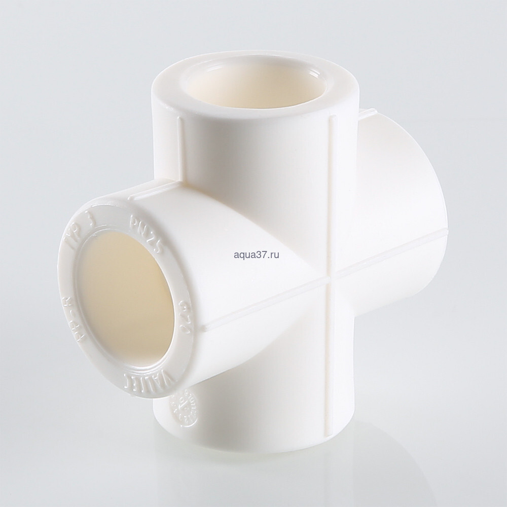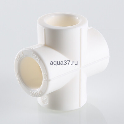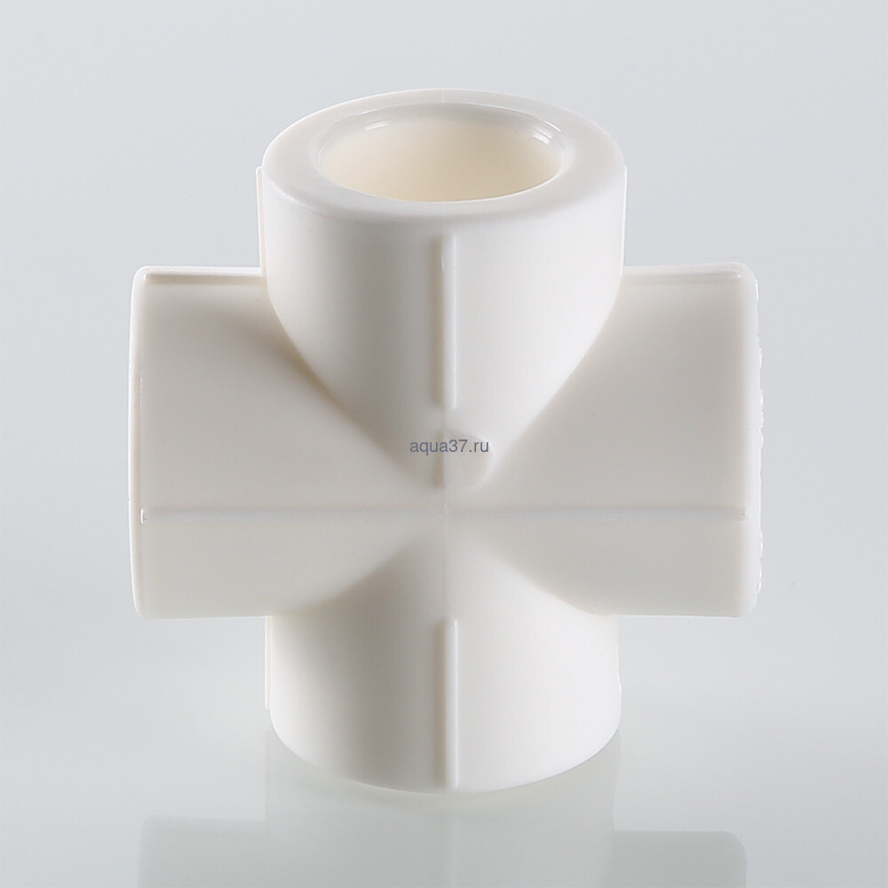 Фитинг для соединения четырех полипропиленовых труб равного диаметра (крестовина). Монтаж производится методом раструбной сварки.