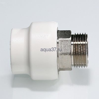 Прямой полипропиленовый фитинг для соединения полипропиленовой трубы и компонента инженерной системы с резьбовым подключением. Резьба фитинга – наружная трубная по ГОСТу 6357. Предусмотрен участок закладной детали под гаечный ключ.