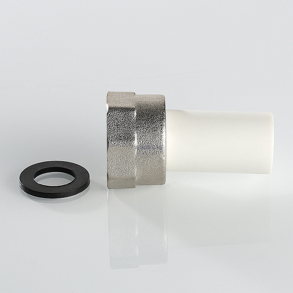 Штуцер полипропиленовый с накидной гайкой. Позволяет подсоединить к трубопроводу из полипропилена элемент системы с резьбовым подключением. Накидная гайка выполнена из латуни, никелирована. Резьба – внутренняя.