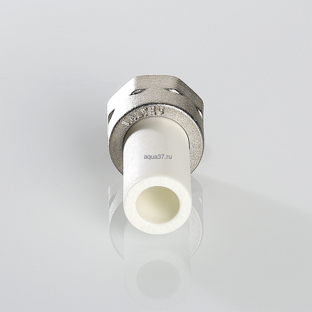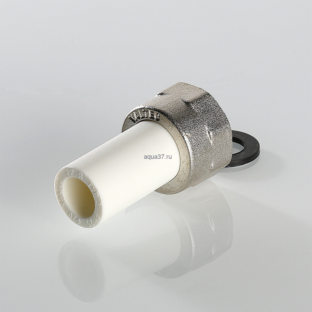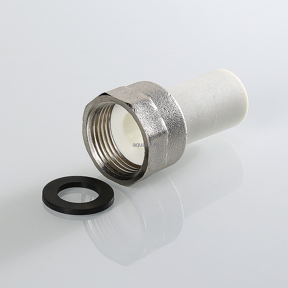 Штуцер полипропиленовый с накидной гайкой. Позволяет подсоединить к трубопроводу из полипропилена элемент системы с резьбовым подключением. Накидная гайка выполнена из латуни, никелирована. Резьба – внутренняя.