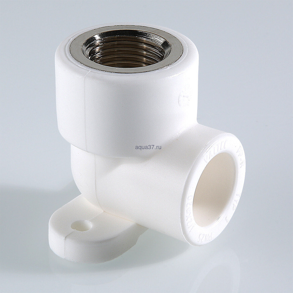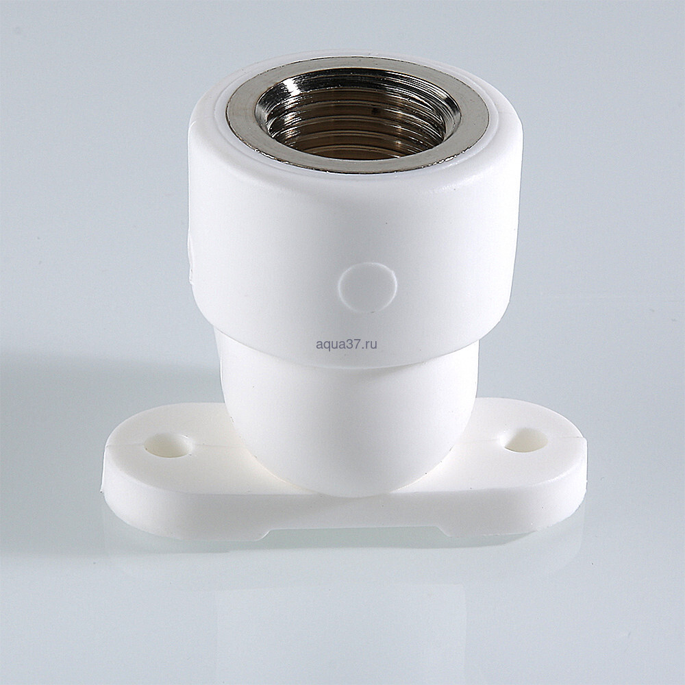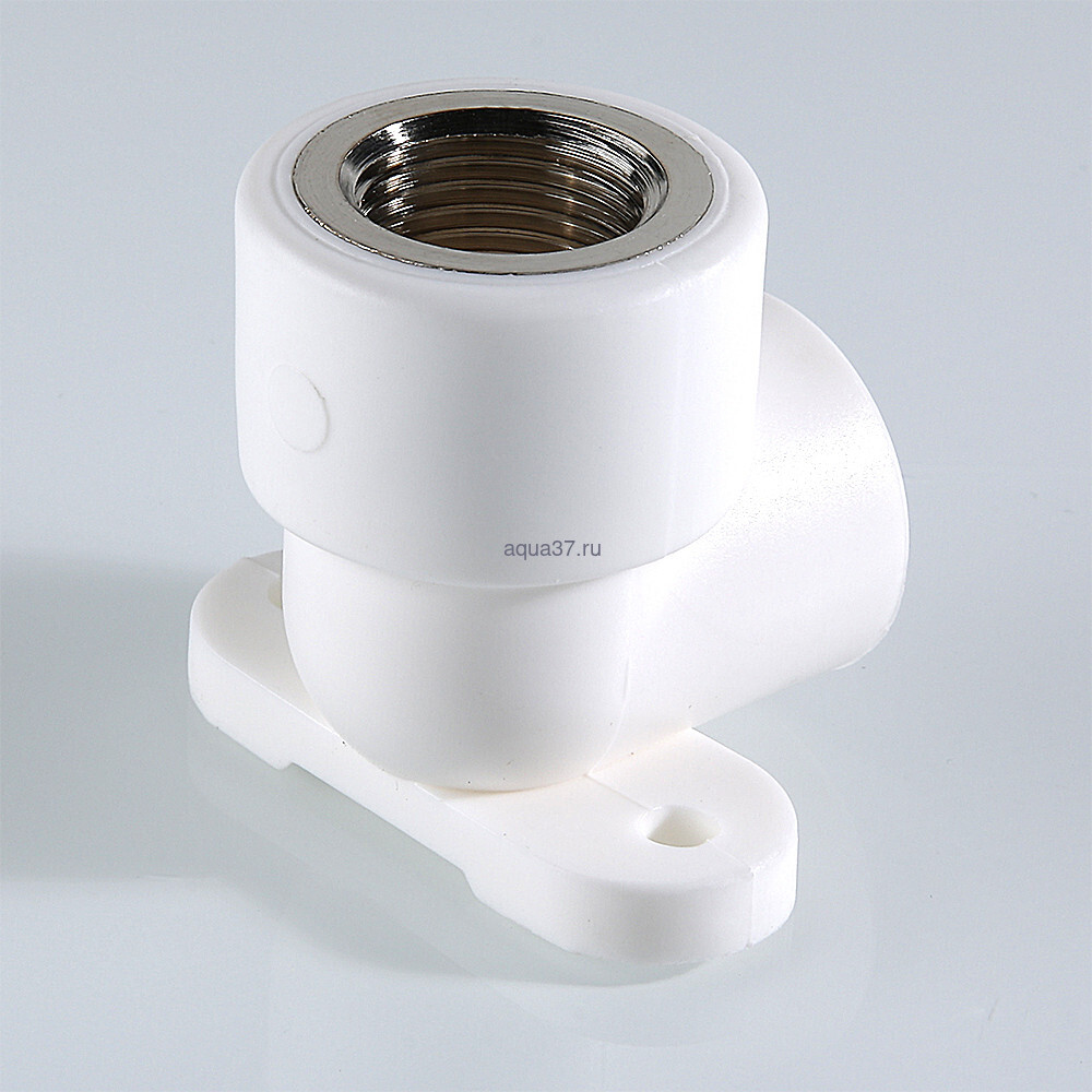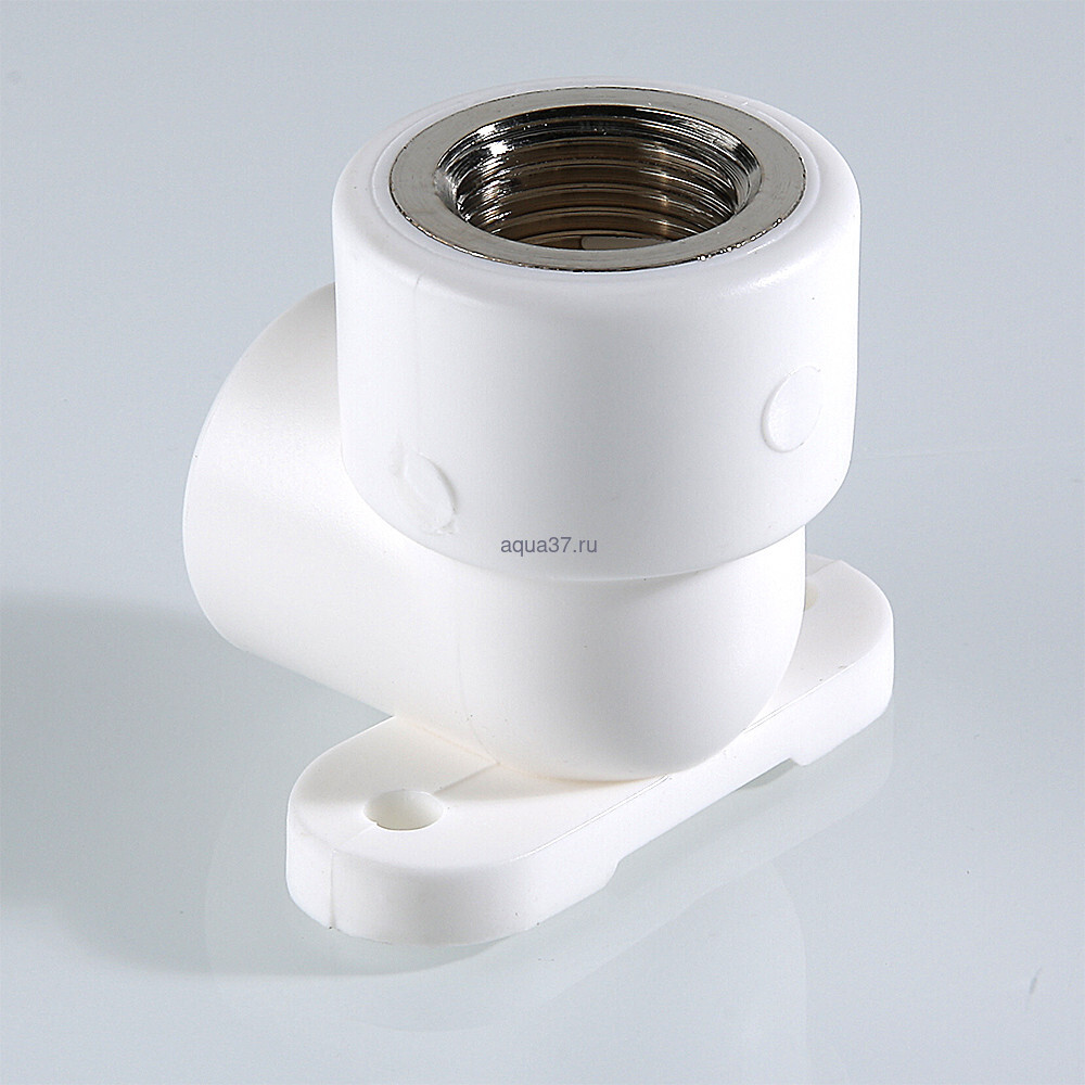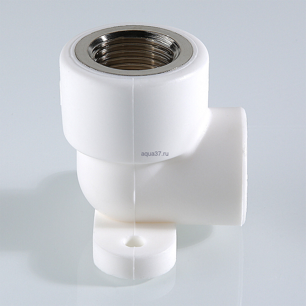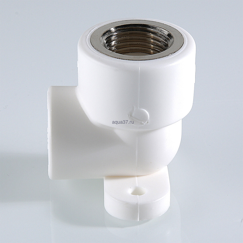 Комбинированный угловой фитинг с креплением (полипропиленовая водорозетка), предназначенный для подсоединения к полипропиленовому трубопроводу сантехнического смесителя или другого компонента инженерной системы с резьбовым подключением. Резьба фитинга – внутренняя трубная по ГОСТу 6357.