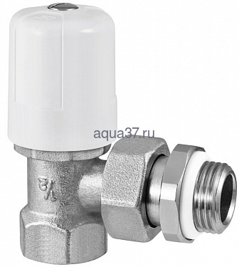 Угловой ручной клапан простой регулировки для стальной трубы. Корпус из никелированной латуни. Уплотнения из эластомера этилен-пропилена и эластомера нитрила. Ручка из ударопрочного пластика ABS. Линейное присоединение, внутренняя резьба UNI-ISO 228 для стальных труб. Присоединение к радиатору внешняя резьба UNI-ISO 228 с уплотнением из тефлона (RFS).