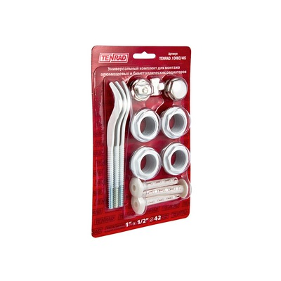 Комплект предназначен для монтажа алюминиевых и биметаллических радиаторов с присоединительным размером верхнего и нижнего коллекторов 1" (внутренняя резьба). В состав комплекта включены четыре футорки 1 x ¾" – две правые и две левые. Футорки снабжены силиконовыми прокладками. Также в комплект включены пробка для футорки, ручной самоуплотняющийся воздухоотводчик, ключ для воздухоотводчика, кронштейны и дюбели для крепления радиатора к стене. Кронштейны, как и футорки выполнены из оцинкованной стали, окрашены белой (RAL 9010) эпоксидной эмалью. Элементы комплекта рассчитаны на рабочее давление до 16 бар. В качестве теплоносителя в системе может применяться как вода, так и незамерзающая жидкость.