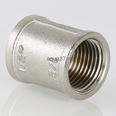 Соединительная муфта с внутренней резьбой. Изготовлена методом объемного горячего объемного прессования из сантехнической латуни марки CW617N (европейский стандарт EN12165) с гальваническим нанесением никелевого покрытия. Цилиндрическая трубная резьба муфты совместима также с наружной конической по ГОСТ 6211 (ISO R7). Максимальное избыточное давление применения фитинга определяется максимальной температурой рабочей среды, типоразмером изделия (условным диаметром до/более 1”): при 120 °С – 40/25, 200 – 30/27, 250 – 27/17 бар.