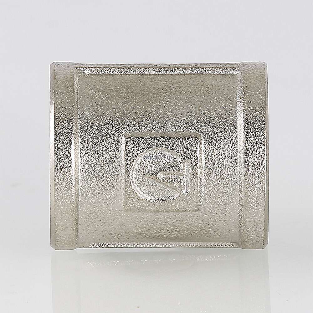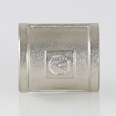 Соединительная муфта с внутренней резьбой. Изготовлена методом объемного горячего объемного прессования из сантехнической латуни марки CW617N (европейский стандарт EN12165) с гальваническим нанесением никелевого покрытия. Цилиндрическая трубная резьба муфты совместима также с наружной конической по ГОСТ 6211 (ISO R7). Максимальное избыточное давление применения фитинга определяется максимальной температурой рабочей среды, типоразмером изделия (условным диаметром до/более 1”): при 120 °С – 40/25, 200 – 30/27, 250 – 27/17 бар.