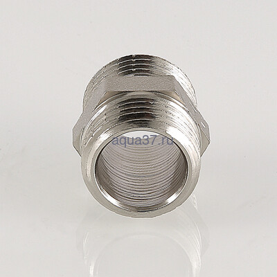 Латунный никелированный фитинг для соединения элементов трубопровода равного диаметра. Резьба – наружная/наружная, цилиндрическая трубная по ГОСТу 6357 (ISO 228, EN 10226). Предусмотрен участок корпуса шестигранной формы, под гаечный ключ.