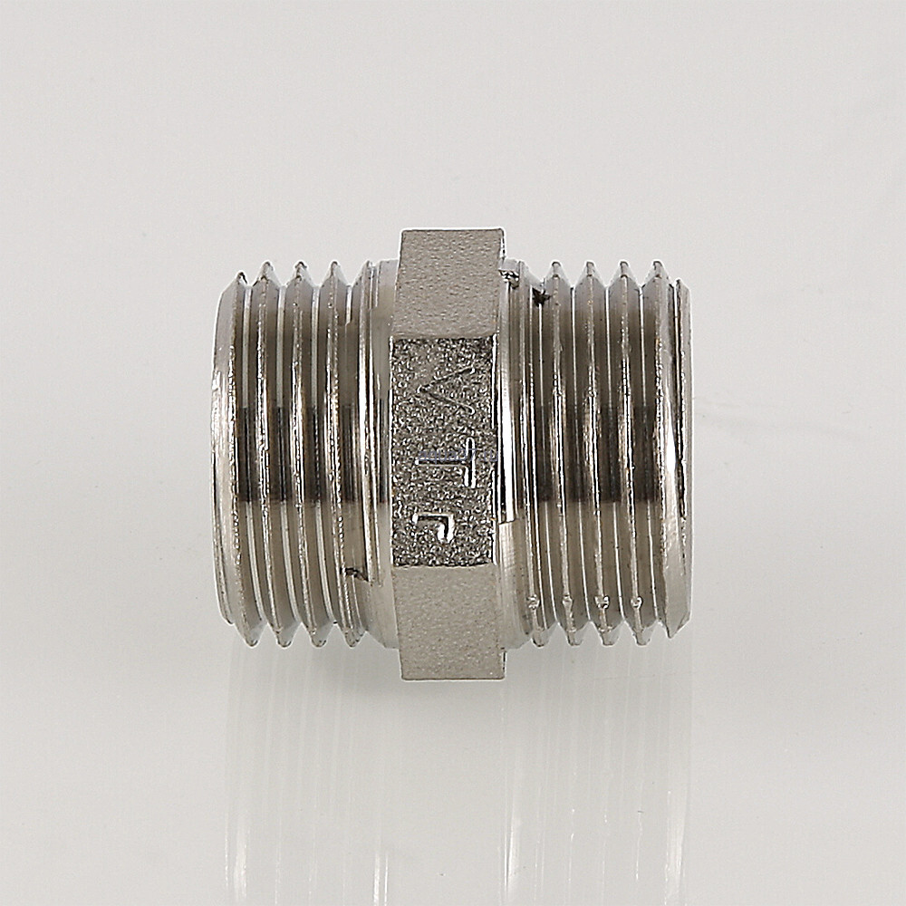 Латунный никелированный фитинг для соединения элементов трубопровода равного диаметра. Резьба – наружная/наружная, цилиндрическая трубная по ГОСТу 6357 (ISO 228, EN 10226). Предусмотрен участок корпуса шестигранной формы, под гаечный ключ.