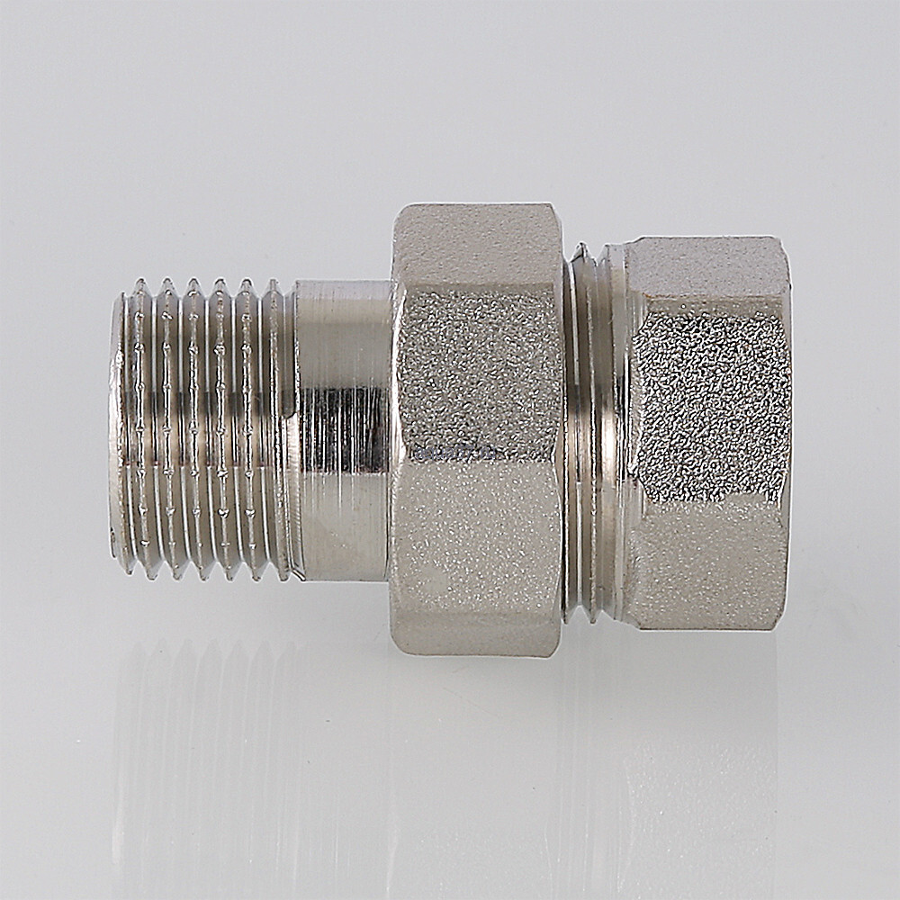 Прямой разъемный сгон, смонтированный из двух частей с помощью накидной гайки (соединение типа «американка»). Резьба – внутренняя/наружная, цилиндрическая трубная по ГОСТу 6357 (ISO 228, EN 10226). Внутренняя резьба совместима также с наружной конической трубной резьбой по ГОСТу 6211 (ISO R7). Детали выполнены из латуни, никелированы. Уплотнительное кольцо – из синтетического каучука EPDM. Гайку следует накручивать с приложением момента не более 30 H•м.