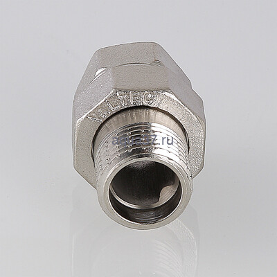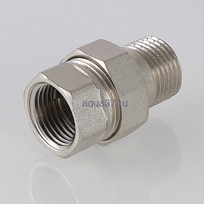 Прямой разъемный сгон, смонтированный из двух частей с помощью накидной гайки (соединение типа «американка»). Резьба – внутренняя/наружная, цилиндрическая трубная по ГОСТу 6357 (ISO 228, EN 10226). Внутренняя резьба совместима также с наружной конической трубной резьбой по ГОСТу 6211 (ISO R7). Детали выполнены из латуни, никелированы. Уплотнительное кольцо – из синтетического каучука EPDM. Гайку следует накручивать с приложением момента не более 30 H•м.