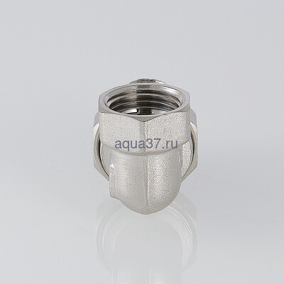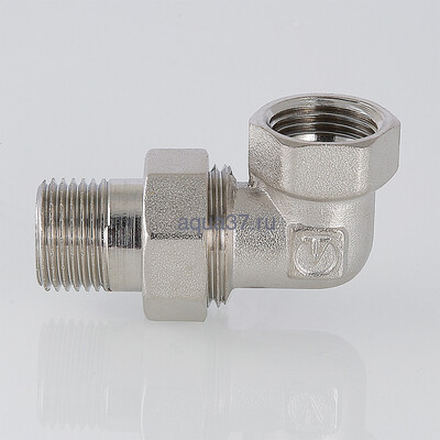 Разъемный угловой сгон, соединение компонентов которого осуществляется накидной гайкой (угловая американка). Материал фитинга – сантехническая латунь CW617N. Детали никелированы. Конструкция соединителя содержит уплотнительное кольцо из эластомера EPDM. Рабочая температура ограничена для изделия 120 °C. Номинальное давление моделей диаметром до 1” включительно составляет 40, свыше – 25 бар. Резьба фитинга – внутренняя/наружная, оснащенная насечками для наилучшего удержания герметика. Максимальное усилие накручивания гайки – 30 H•м. Область использования углового сгона – трубопроводы из стали, меди, латуни, пластиковые, металлопластиковые.