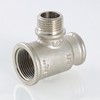 Резьбовой фитинг – тройник переходной с переходом на наружную резьбу изготовлен из латуни марки CW617N методом горячего штампования с последующим нанесением никелевого гальванопокрытия. Применяется для создания разъемных резьбовых соединений на трубопроводах из стальных, медных, латунных, пластиковых и металлопластиковых труб. Комбинация присоединительных патрубков данной модели позволяет смонтировать участок трубопровода соответствующей конфигурации без дополнительных соединителей. Резьба фитинга – трубная цилиндрическая по ГОСТу 6357 (ISO 228, EN 10226), внутренняя/наружная/внутренняя.