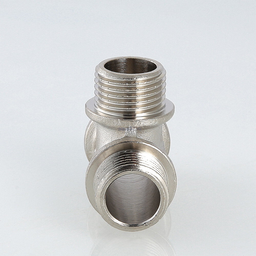Латунный никелированный трехсторонний фитинг (тройник), равнопроходной. Резьба – наружная, цилиндрическая трубная по ГОСТу 6357 (ISO 228, EN 10226).