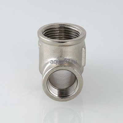 Резьбовой фитинг – тройник с переходом на наружную резьбу изготовлен из латуни марки CW617N методом горячего штампования с последующим нанесением никелевого гальванопокрытия. Применяется для создания разъемных резьбовых соединений на трубопроводах из стальных, медных, латунных, пластиковых и металлопластиковых труб. Резьба – трубная цилиндрическая по ГОСТу 6357 (ISO 228, EN 10226), наружная/внутренняя/внутренняя. Допускается соединение внутренней резьбы с наружной конической трубной по ГОСТу 6211 (ISO R7). Наружная резьба фитинга имеет насечки для эффективного удержания уплотнительного материала.