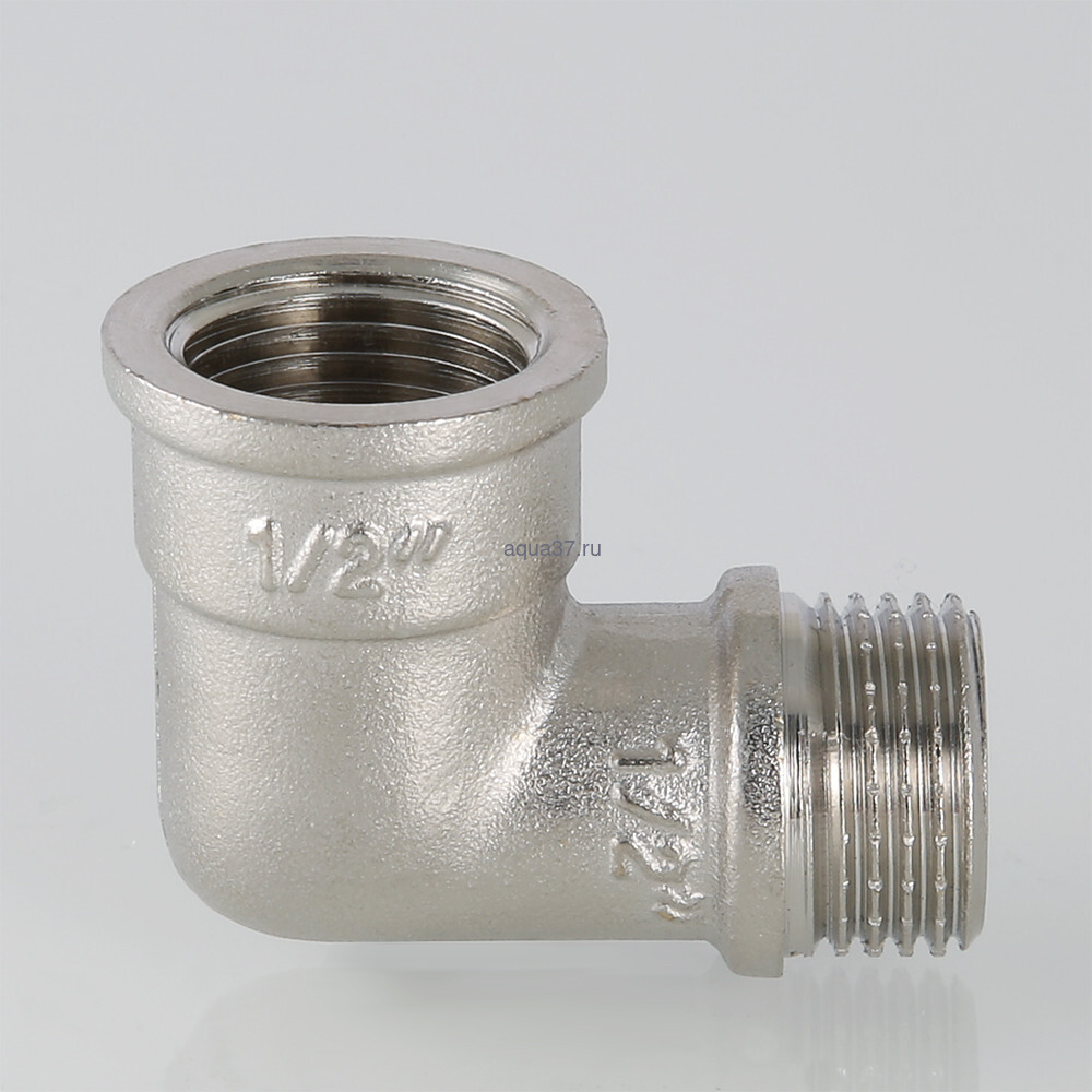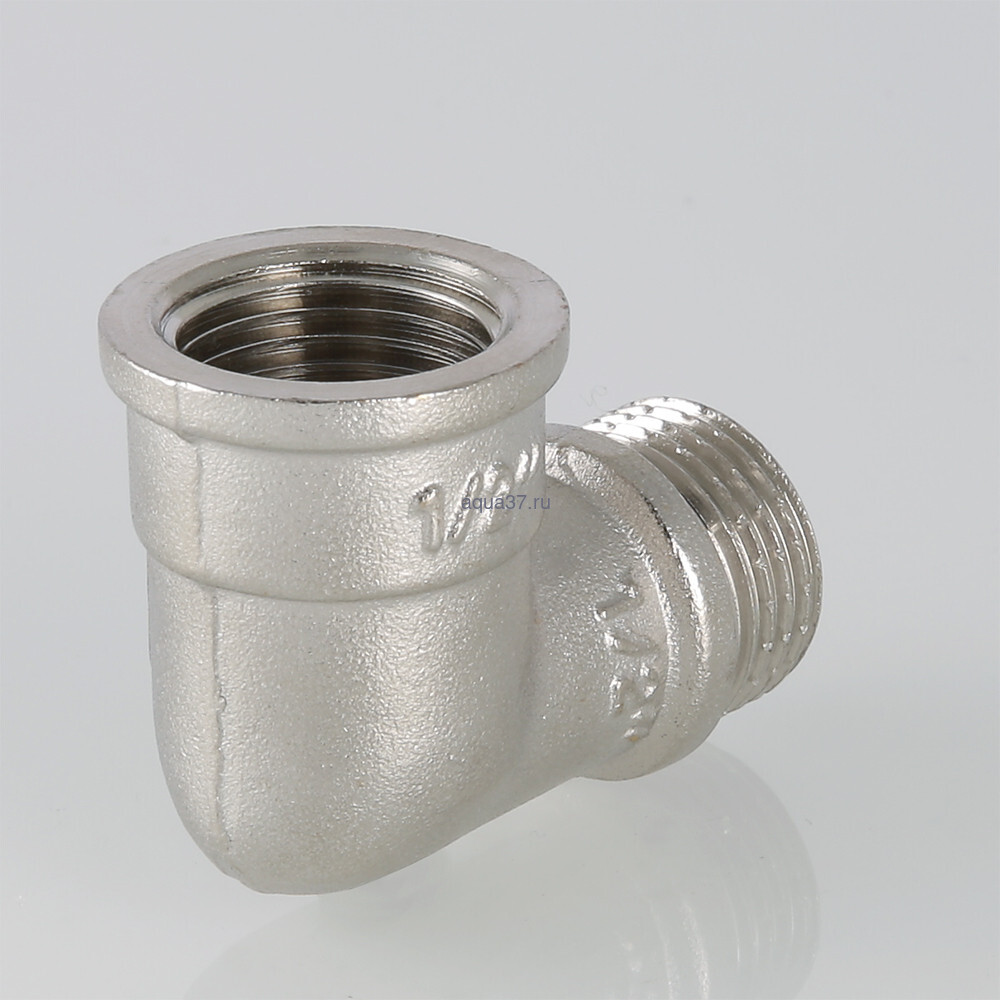 Угловой латунный никелированный фитинг. Резьба – внутренняя/наружная, цилиндрическая трубная по ГОСТу 6357 (ISO 228, EN 10226). Внутренняя резьба фитинга совместима также с наружной конической резьбой по ГОСТу 6211 (ISO R7).