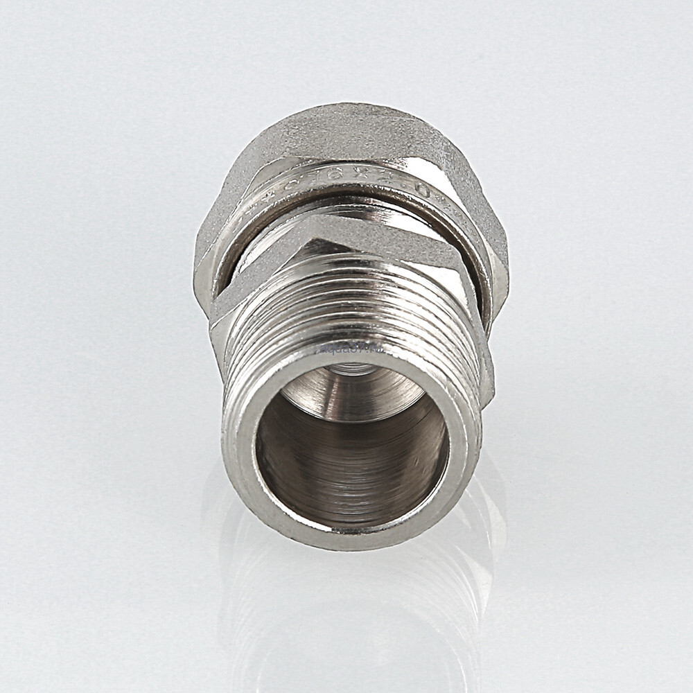 Прямой латунный никелированный фитинг для соединения металлополимерной трубы и компонента системы с резьбовым подключением. Резьба фитинга – наружная трубная по ГОСТу 6357.