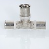 Пресс-фитинг – тройник предназначен для соединения трех труб – металлопластиковых либо из сшитого полиэтилена. Корпус выполнен из сантехнической латуни марки CW617N, уплотнительные кольца штуцеров – из EPDM плотностью 1,22 г/см3, пресс-гильзы – из нержавеющей стали. Нейлоновая обойма выполняет функции фиксатора гильзы, направляющей для пресс-насадок и диэлектрической прокладки, прерывающей контакт между алюминием трубы и латунью корпуса. Конструкция пресс-фитингов VALTEC обеспечивает повышенную пропускную способность, надежность соединений, прочность и термостойкость. Монтаж фитинга производится пресс-инструментом с насадкой «ТН». Типоряд содержит равнопроходные и переходные пресс-тройники.