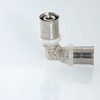 Пресс-фитинг – угольник, обеспечивающий соединение труб (металлопластиковых или из сшитого полиэтилена) под углом 90 градусов. Особенности конструкции изделия, используемые материалы обусловили надежность соединений, повышенную пропускную способность, температурную стойкость, механическую прочность. При изготовлении пресс-угольника используются высококачественные материалы: сантехническая латуни CW617N с никелевым покрытием (корпус), нержавеющая сталь (гильза), EPDM (уплотнительные кольца, 2 шт. для каждого штуцера). Фиксатор, одновременно играющий роль диэлектрической прокладки, делается из нейлона. Монтаж соединителя выполняется пресс-инструментом с насадкой «ТН».