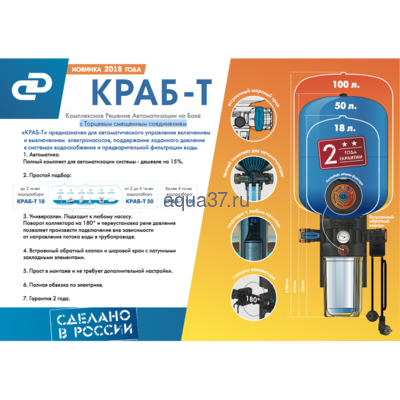 Джилекс "КРАБ" (50 литров) - Комплексное Решение Автоматизации на Баке с Торцевым смещенным соединением. Предназначен для автоматического управления включением и выключением электронасосов, поддержания заданного давления в системах водоснабжения и предварительной фильтрации воды.
